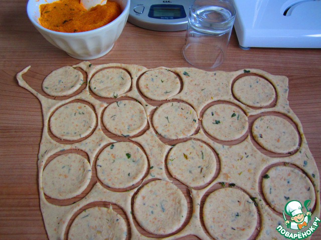 Тесто раскатываем так, как Вы привыкли это делать. Я раскатала тесто и вырезала стаканчиком кругляшки. Выкладываем на них начинку и лепим как вареники. Тем кармашкам, которые я лепила для жарки, я придала форму пирожков.