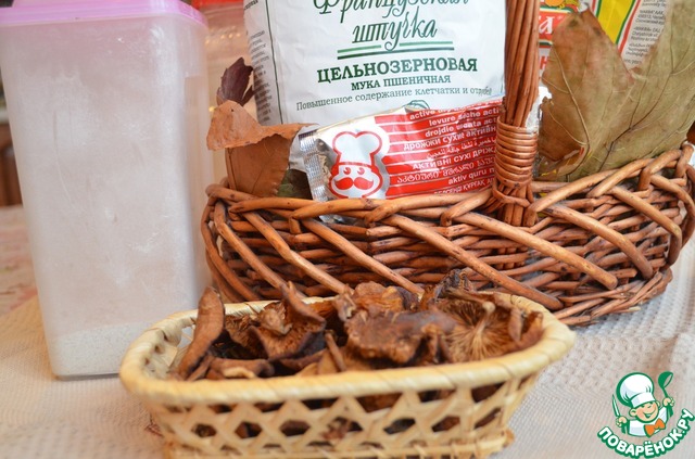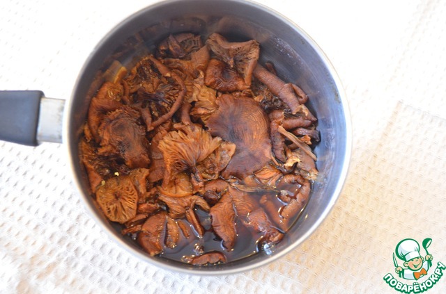 В это же время залейте сухие грибы горячей водой. Я еще и подварила немного свои грибы. Оставьте на 1-2 ч. грибы в этой воде. Затем грибную воду слейте в отдельную емкость, она нам пригодится в дальнейшем. Грибы обсушите.