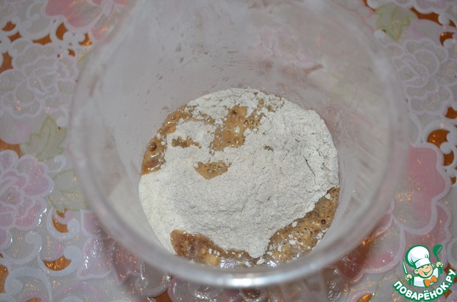 Ставим опару-дрожжи рамешать в теплой воде. После того, как начнут бродить-влейте в миску с двумя видами муки ( высший сорт 100г. и цельнозерновая 100г). Перемешайте. В этот момент, если опара получилась очень густой, можно добавить немного воды. Затяните пленкой и поставьте в теплое место бродить на 3-4ч.