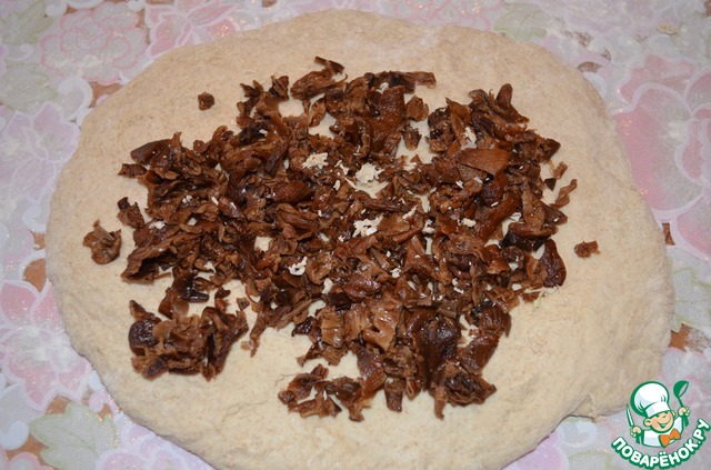 Грибы мелко порубить. Тесто выложить на подпыленную мукой поверхность, расплющить в шар, сверху выложить грибы.
