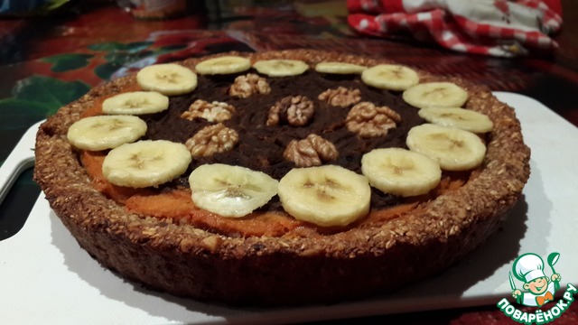 13)Достаём основу для пирога из духовки, выкладывает тыквенно-финиковое пюре, затем тыквенно-кэробовое (тут можно проявить фантазию и покреативить), ставим в духовку на 30-40 минут.
