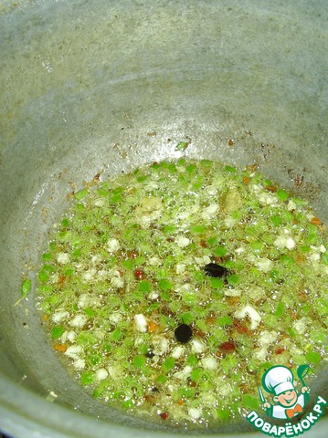 Нагреваем в казане (как видно на фото, он у меня заслуженный) растительное масло, обжариваем кумин, перец и имбирь. Свежий имбирь можно заменить 0,25 чайной ложки молотого сухого имбиря. У меня всегда дома есть кумин (на случай плова), но тут - о горе мне! - не оказалось. На помощь пришла готовая смесь для плова. Через минуту после начала обжаривания добавляем чеснок. Или асфетиду, если вдруг она у Вас водится.