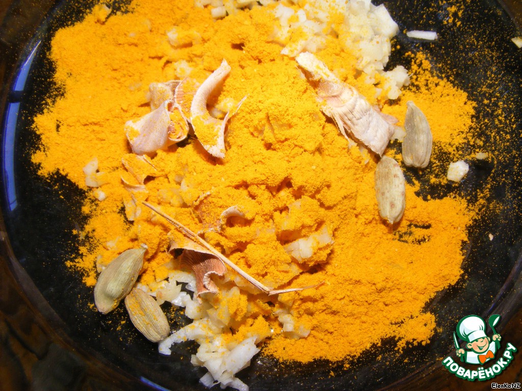 Чеснок и имбирь порубить мелко, добавить сорго лимонное ( по-английски это lemon-grass), кардамон, куркуму.