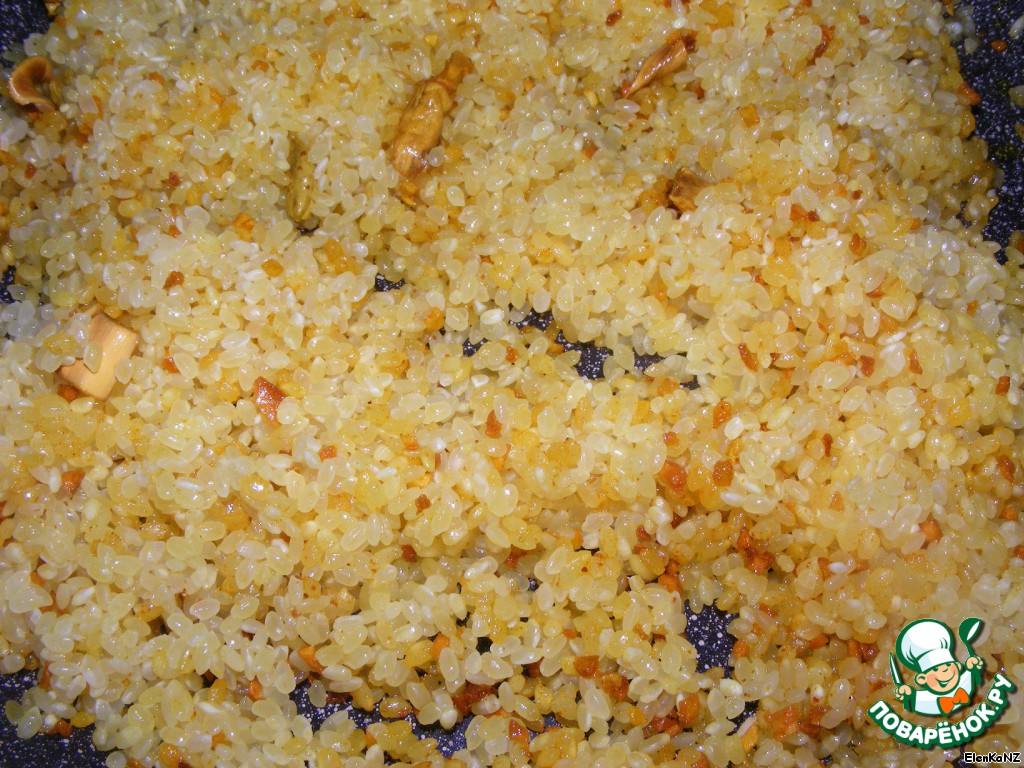 Добавить промытый рис, хорошо перемешать пока рис не станет желтого цвета.