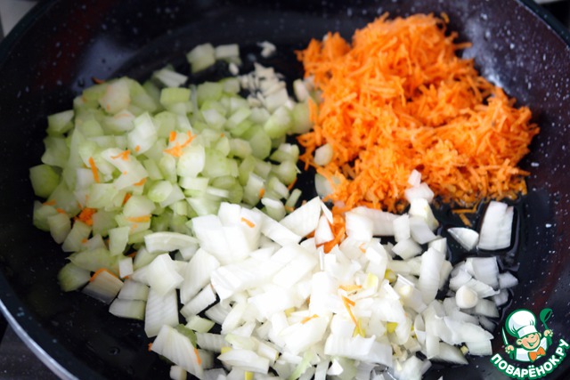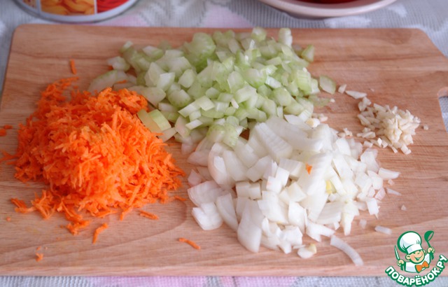 Тем временем овощи моем, очищаем. Морковь натираем на средней терке, чеснок мелко режем, лук и сельдерей нарезаем кубиками примерно по 0,5 см.
