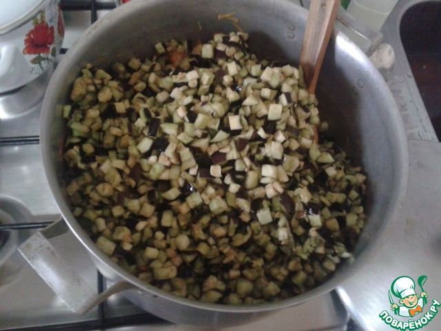 Баклажаны режем кубиками заливаем водой и сыпем соль пару жменей. Пусть стоит. Раньше этого не делали никогда, но сегодня баклажаны показались горькими. Лук кубиками, перец кубиками, морковь на терке. Помидоры с чесноком и горьким перцем молим на мясорубке.