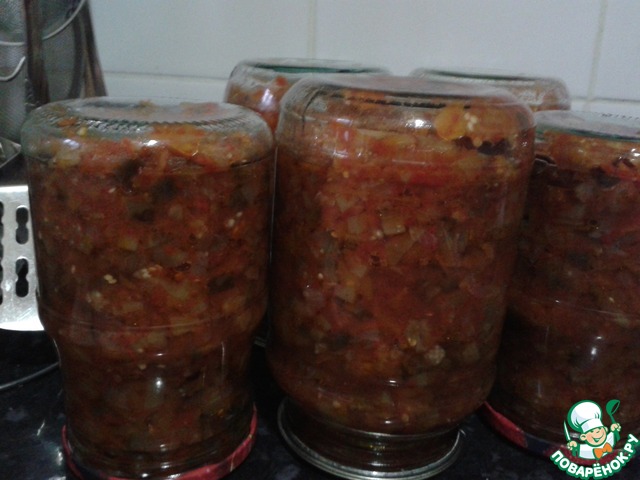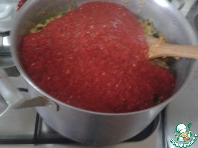 Как все пережарилось заливаем молотыми помидорами. Сыпем соль и сахар. Как закипит варим 40 мин. Разливаем по банкам и стерилизуем