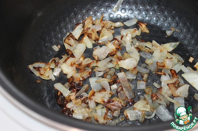 В чашу мельтиварки положить сливочное масло, включить режим жарка и обжарить до золотистости мелко порезанный репчатый лук