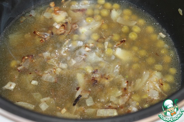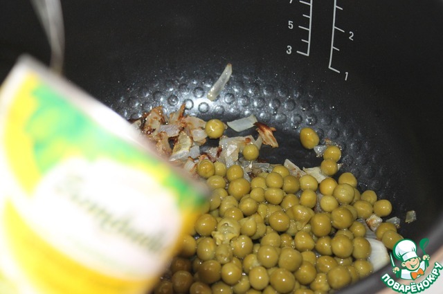 Затем добавить зеленый горошек. Одну ложка горошка оставить для украшения. Прогреть