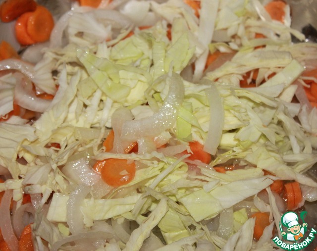Затем добавить нарезанную мелко капусту, тщательно перемешать. Включить режим "Cake" и тушить в этом режиме, добавив немного на дно мультиварки воды