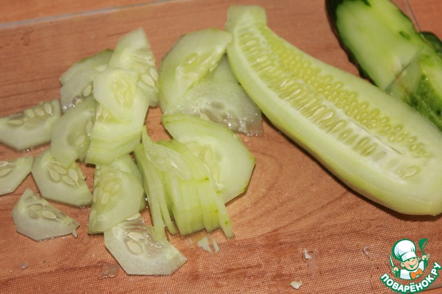 Перчик нарезать тонкими полосками и также добавить в чашу к остальным овощам