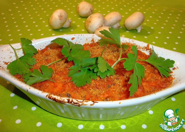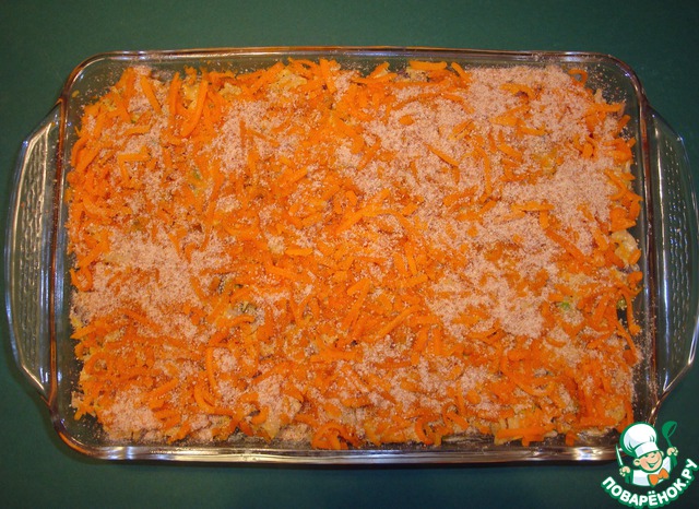 Выкладываем полученную массу в жаропрочную форму, смазанную маслом (размер 20x30 см или порционные формочки). Сверху посыпаем оставшимся сыром и панировочными сухарями.