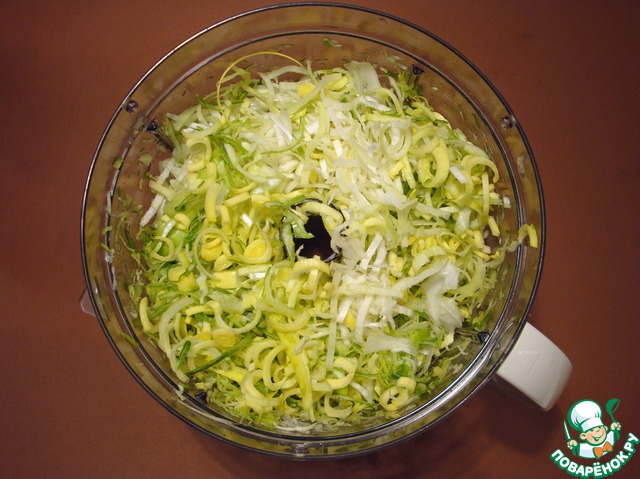 Лук-порей разрезаем вдоль, тщательно промываем и шинкуем. Натираем сыр. Включаем духовку на 225 °C.