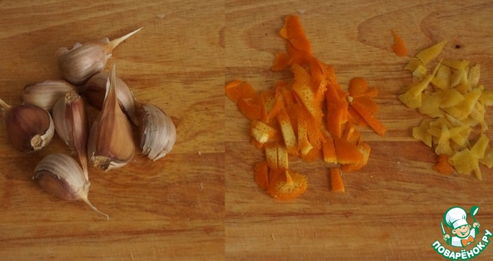 Приготовим необыкновенно вкусный соус. Для этого снимем цедру с половины лимона и с половины апельсина, измельчим. Чеснок очистить от верхней шелухи, разделить на дольки.