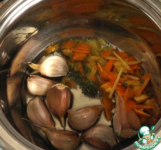 В небольшую кастрюльку сложить цедру, чеснок, тимьян, добавить оливковое масло и воду. Довести до кипения и проварить на тихом огне 15-20 минут до размягчения чеснока.