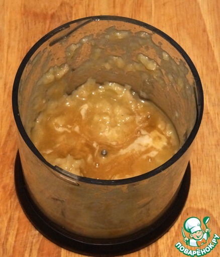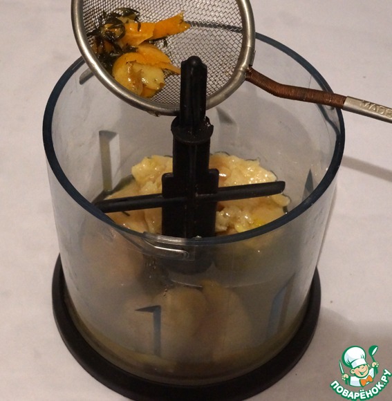 Положить чеснок в блендер, туда же процедить масло из кастрюльки. Измельчить в пюре.