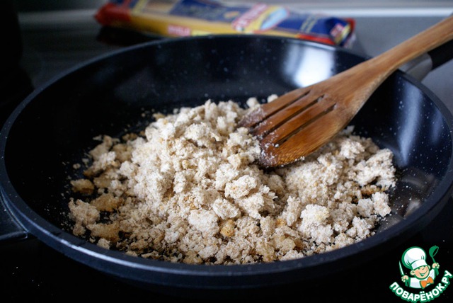 Добавить в сковороду хлебную крошку и подрумянить таким образом, чтобы хлеб пропитался маслом и обжарился, но не плавал в нем. Выключить огонь и немного остудить.