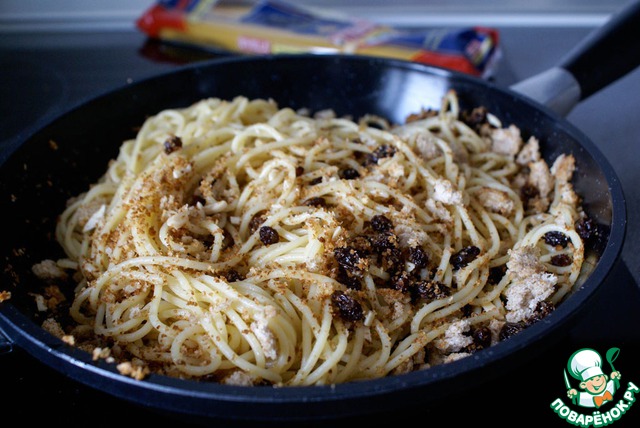 Как и практически любое блюдо из пасты, подавать сразу. Здесь я хотела бы сказать, что в детстве я часто ела макароны с сахаром и сливочным маслом, и мне это нравилось. Но этот вариант - нечто другое. Количество сахара регулируется по своему вкусу и спагетти получаются лишь слегка сладковатыми, а оливковое масло, ароматизированное чесноком, определяет итальянский вкус блюда. В Сицилийской кухне встречаются даже такие сочетания как изюм и анчоусы, и я хочу сказать, что это действительно может быть вкусным!