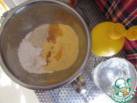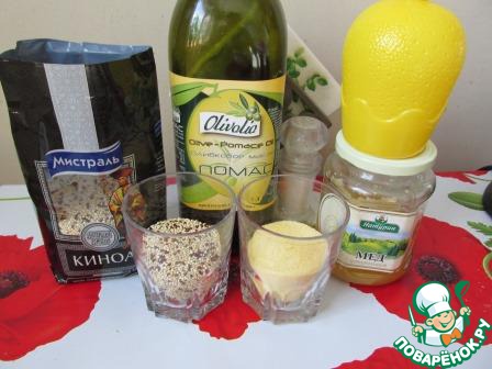 В миске смешать муку из киноа, кукурузную муку, соль, разрыхлитель теста, крахмал. Добавить мёд и оливковое масло.