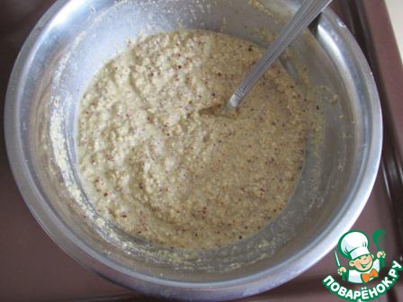 Постепенно вливая воду, замесить тесто. Обычное для оладий, не слишком густое. Количество воды может незначительно изменяться от густоты теста по вашему вкусу.
