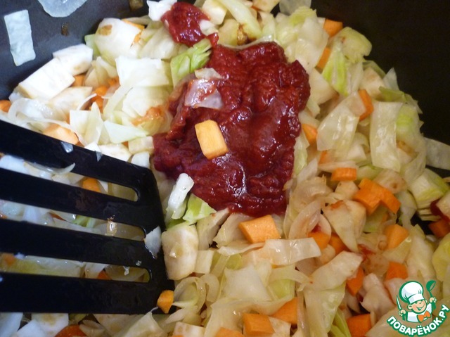 Капусту также нашинкуйте некрупными кусочками, добавьте к овощам вместе с томатной пастой. Перемешайте.