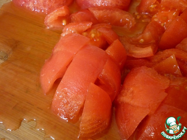 Помидоры на несколько секунд опустите в кипяток, снимите кожицу и нарежьте кубиком. Добавьте к овощам.
