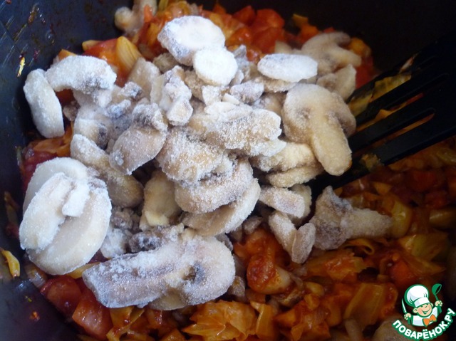 Добавьте шампиньоны. Обжаривайте, периодически помешивая до окончания программы.
