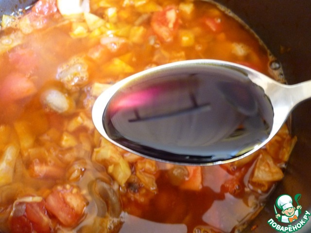 По окончании программы "ЖАРКА" налейте в чашу мультиварки воды столько, чтобы овощи были покрыты водой полностью. Добавьте сахар и соевый соус.