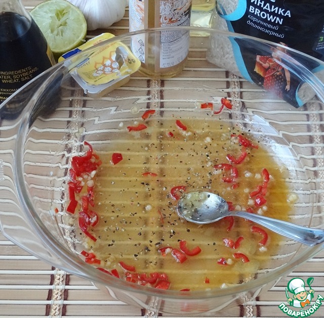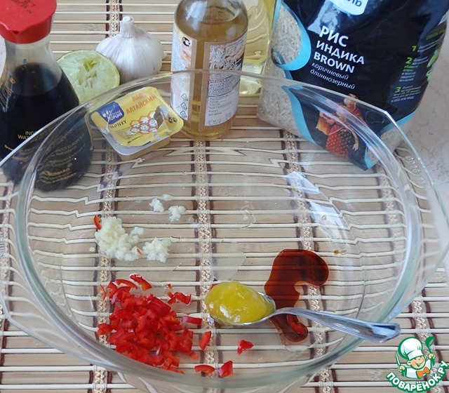 Пока варится рис, соедините в миске масло, сок лайма (лимона), раздавленный чеснок, мелко порезанный чили без семян, соевый соус, мед и уксус.