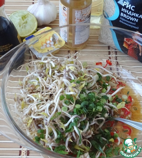 Перемешайте с маринадом порезанный зеленый лук и проростки фасоли.