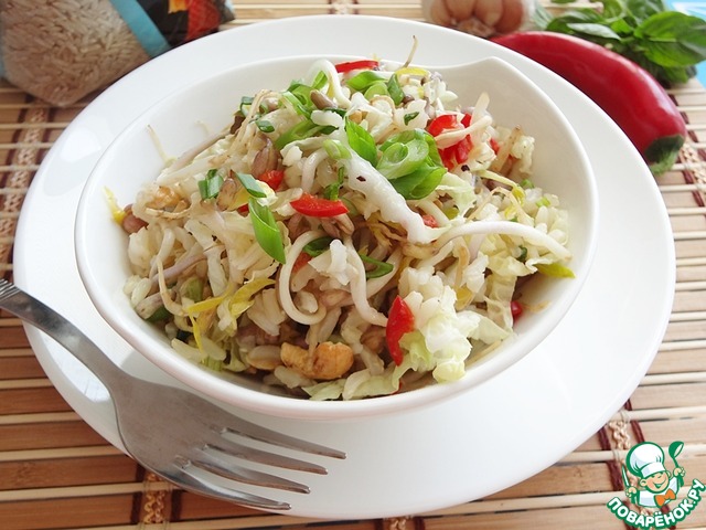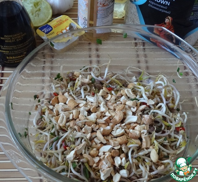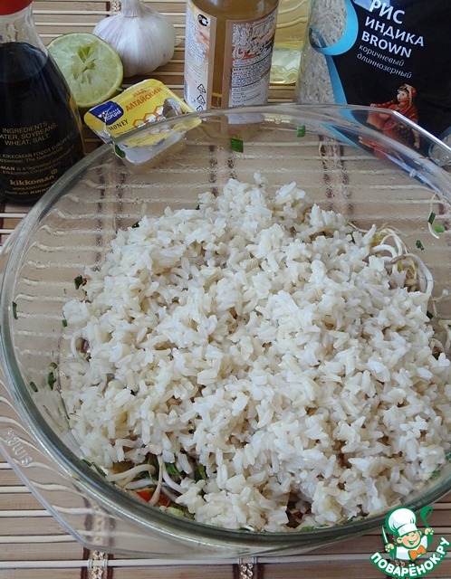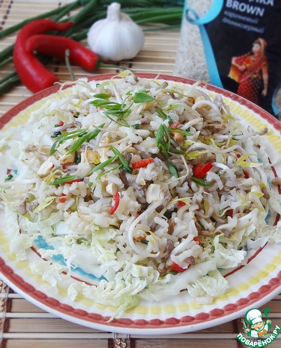 | Проростки фасоли и несоленые орехи делают этот пикантный салат свежим и хрустящим. Он готовится очень легко из коричневого риса и листьев китайской капусты или мелкого молодого шпината. |
