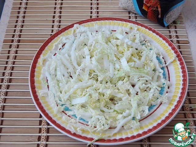 Тонко нашинкуйте листья китайской капусты, тонким слоем распределите на блюде.