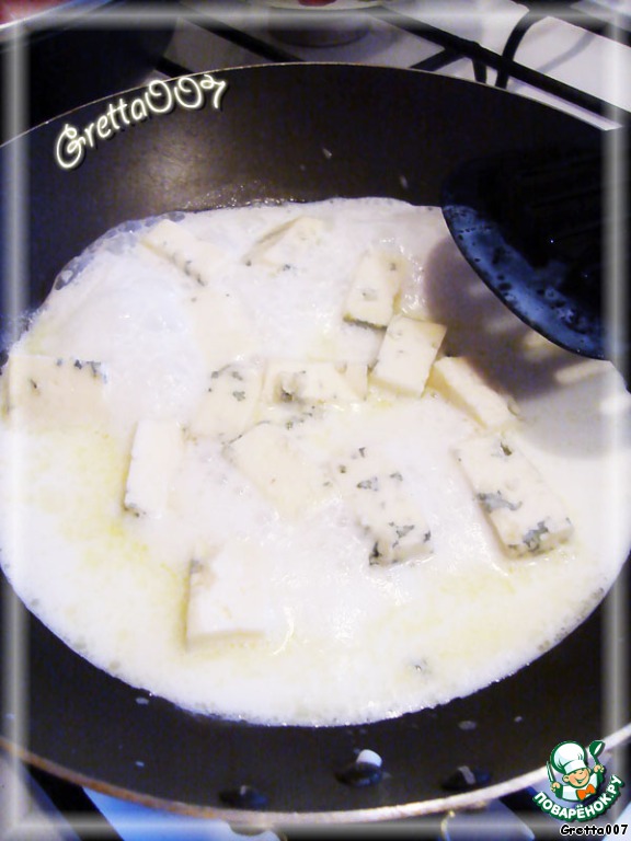 В кипящие сливки выложим оставшийся сыр и, помешивая, дадим ему расплавиться.