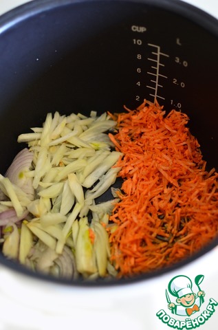 Лук и морковь нарезать соломкой и быстро обжарить со специями около 5 минут.