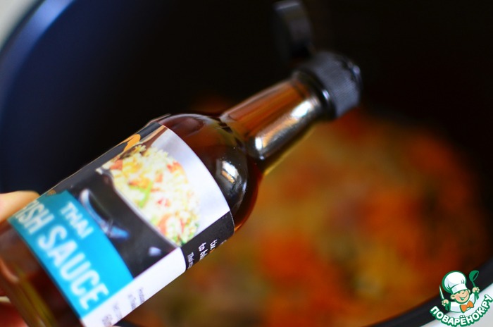 Добавить рыбный соус по вкусу. Выложить всё в отдельную посуду специальной лопаточкой, а чашу мультиварки можно быстро одним движением протереть бумажным потоленцем (а можно и вовсе этого не делать).