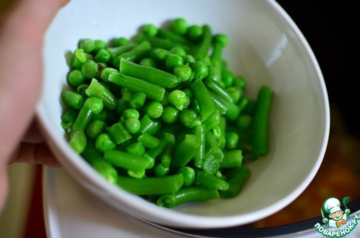Теперь нужно обдать кипятком замороженную фасоль и зеленый горошек, отставить на время в сторону, а мультиварку включить в режиме Поджаривание и налить туда ложку масла.