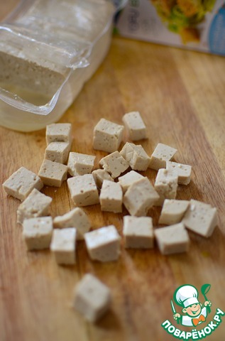 Тем временем нарежьте тофу кубиками. Тофу - это вообще уникальный продукт, его еще называют -"мясо без костей"-богатейший источник легкоусвояемого белка. Не имеет ни запаха, ни вкуса, поэтому как губка впитывает вкусы и запахи других продуктов.