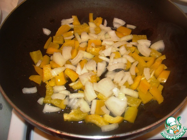 Лук почистить, перец болгарский освободить от семян и плодоножки. Овощи порезать кубиками не крупно. Обжарить в сковороде на оливковом масле до золотистого цвета.