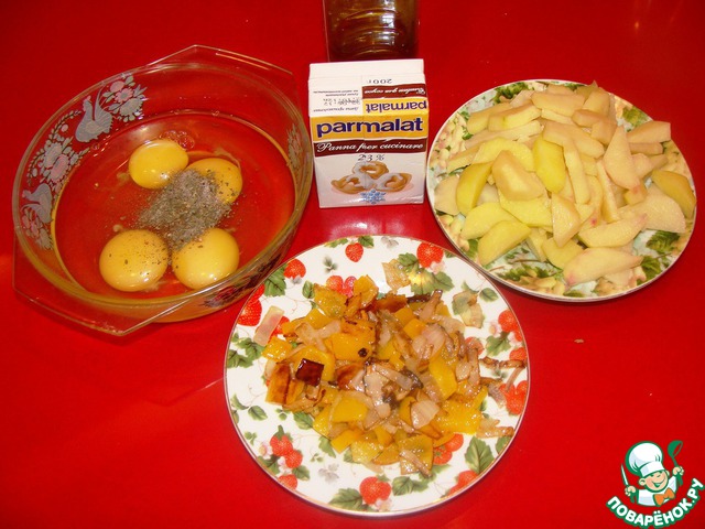 Яйца взбить со сливками, специями и солью до однородной массы.
