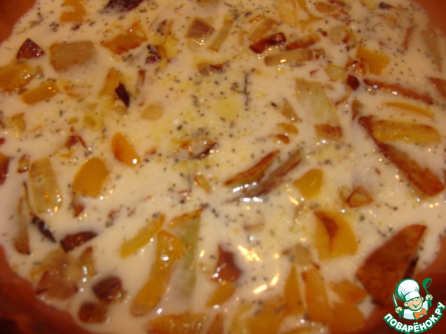 В форму для запекания (у меня она силиконовая, смазывать маслом не требуется) выложить овощи и картофель. Залить полученной яично-сливочной смесью.