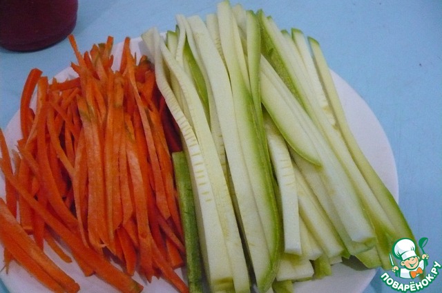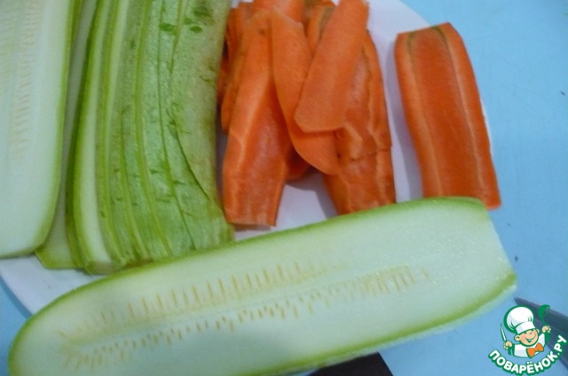 Кабачок и морковь с начало нарежем поперек на тонкие пластины.