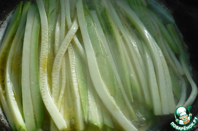 Теперь на сковороду наливаем опять масло и тушим кабачки до полуготовности.