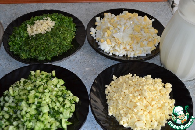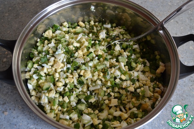Пока процесс идет, мелкими кубиками нарезаем наши продукты. Любители терок могут их потереть, но по моему глубокому убеждению с порезанными получается лучше. Сваренные вкрутую яйца так же измельчаем.