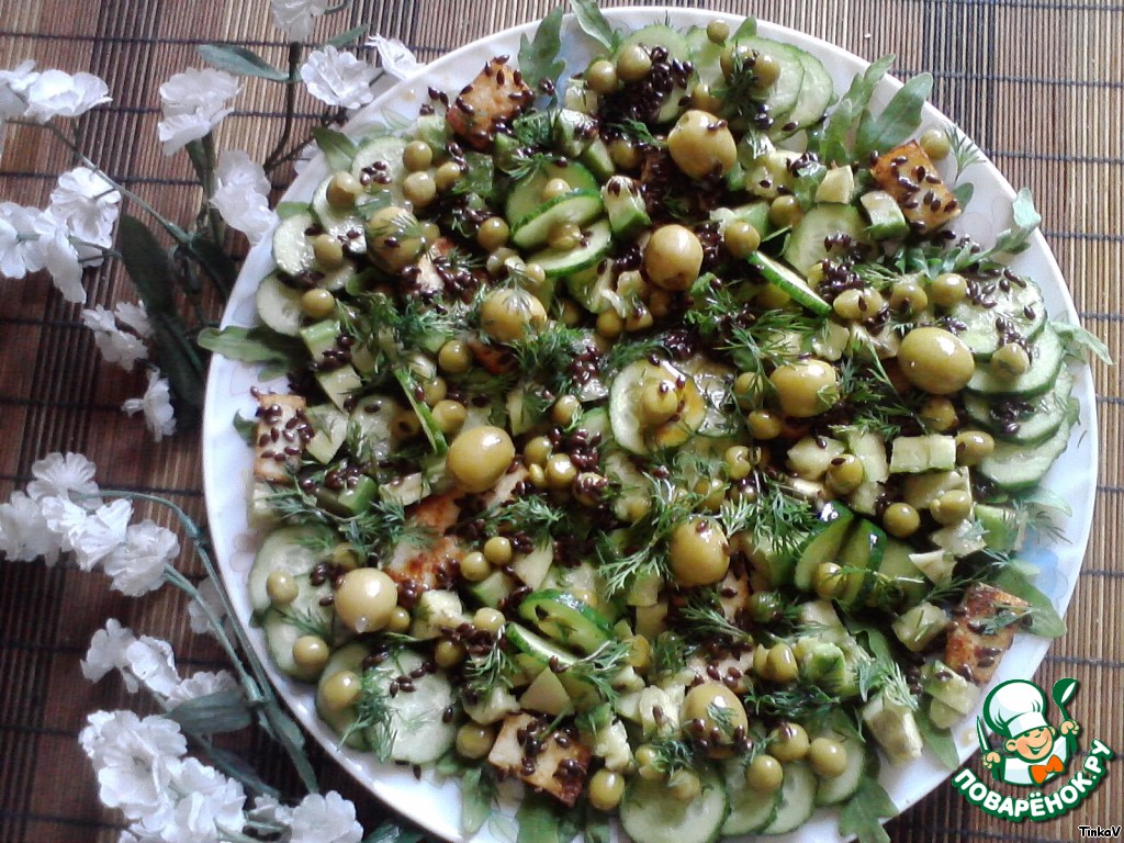 Теперь очередь зеленого горошка и зеленых, опять-таки, оливок. Заодно немного приукрасим окружающую действительность зеленым укропом.