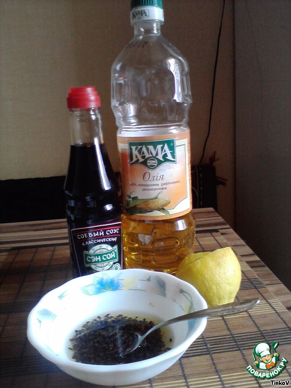 А теперь приготовим для всей этой теплой зеленой компании подобающий соус. Помните, на сковороде у нас оставалось масло с обжаренными семечками льна? Выливаем эту чудо-смесь в пиалочку. Добавляем соевый соус и сок лимона. Если у кого-то найдется лайм, будет тоже хорошо и, безусловно, ароматнее.