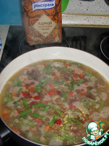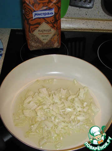Добавляем гречку "Мистраль", соль, перец, специи, заливаем горячей водой, закрываем крышкой и оставляем на маленьком огне пока не выкипит вся вода.
