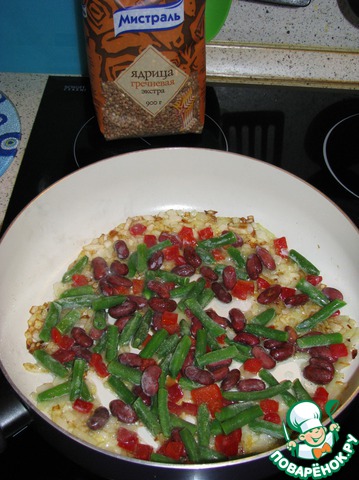 Нам понадобится: гречка "Мистраль", лук, замороженные овощи (можно любые по вашему вкусу), у меня стручковая фасоль, красная фасоль и красный сладкий перец, оливковое масло, соль, перец, специи.