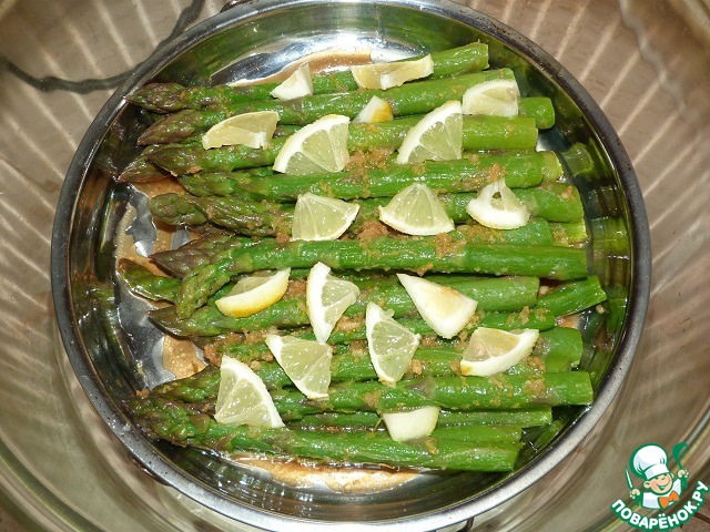 Выкладываем на противень. Если соус остался, то его равномерно и аккуратно вылить на спаржу. Сверху спаржи разложить кусочки лимона.
