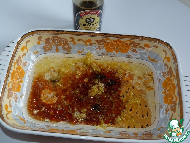 Для соуса смешать растительное масло (лучше оливковое), цедру лимона (приблизительно 2 ч. ложки), лимонный сок (из 1/2 лимона), чеснок (через чеснокодавку), щепотку черного молотого перца и соевый соус (одну или полторы ст. ложки - по вкусу).
