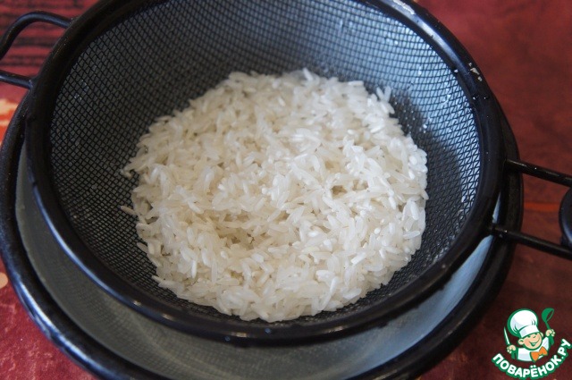 Рис тщательно промыть холодной водой и откинуть на сито, чтобы лишняя влага стекла.